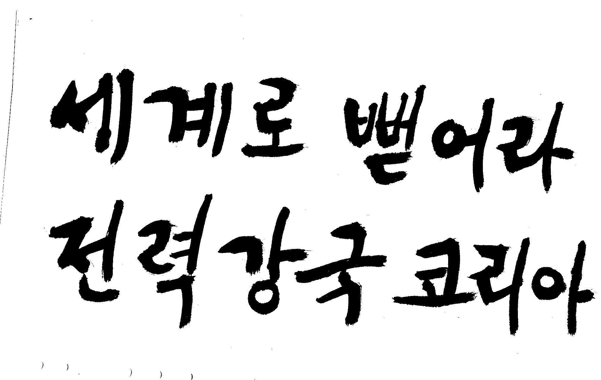 캘리 좀 부탁드려요!~ 김철호 일반 1 12235 2008.12.24 12:08 > > 전력회사 신문광고를 하는데요 캘리로 멋지게 하고픈데 > 캘리프로그램으로 아무리 써도 느낌이 안나옵니다 ㅜ.ㅜ > 이런걸 부탁한다는 자체가 너무나도 염치없지만 부탁드립니다. > > 세계로 뻗어라! 전력강국 코리아 > 보기는 쉬워도 하기는 어려운게 세상 모든 일 일겁니다. 그중에 캘리그라피가 그런것 일 겁니다... 스캔중에 글꼴이 잘린것은 서로다른글꼴서 편집하시길... 글수가 많아서 어쩔 수없네요...